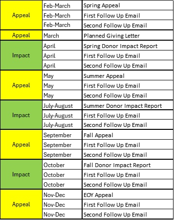 - Here's our recommended schedule for a robust year of direct mail fundraising.
