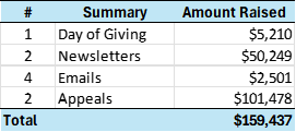 - This table of results for a homeless shelter in a small town shows that adding a (May) appeal and e-Stories with ask buttons added additional revenue. This didn't reduce giving to the other appeals; instead, response increased throughout the year.