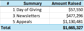 - This table of results from a food related non-profit shows that even with multiple asks during the fall, giving does not drop off-because they are doing a great job telling the stories that show how the donor's money is working.
